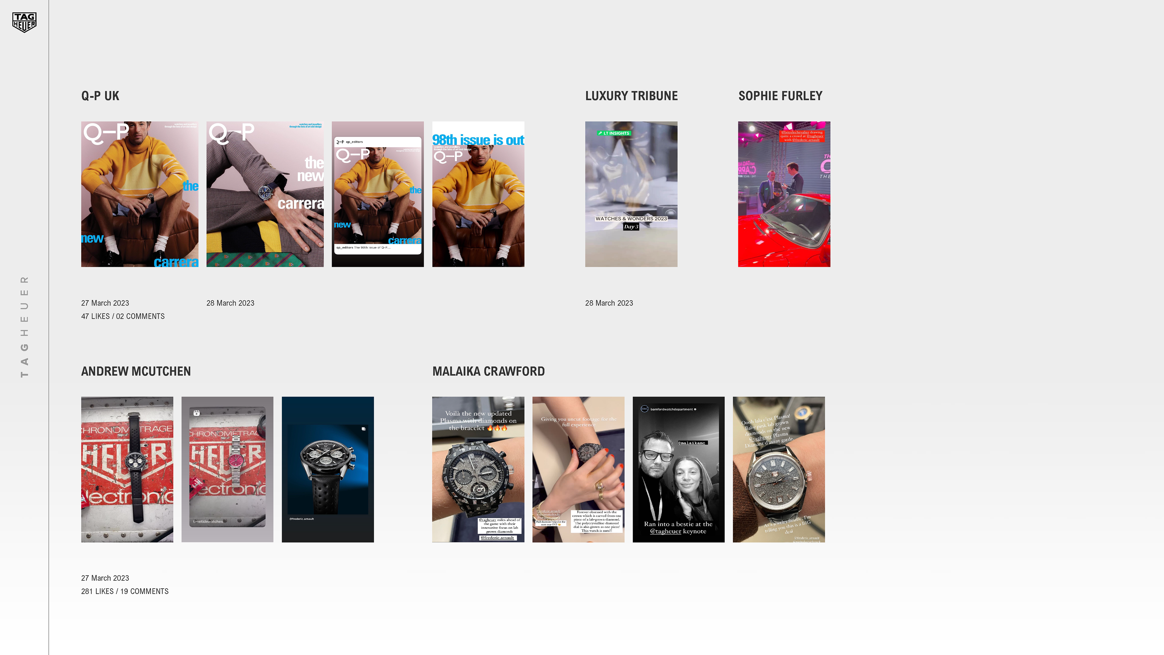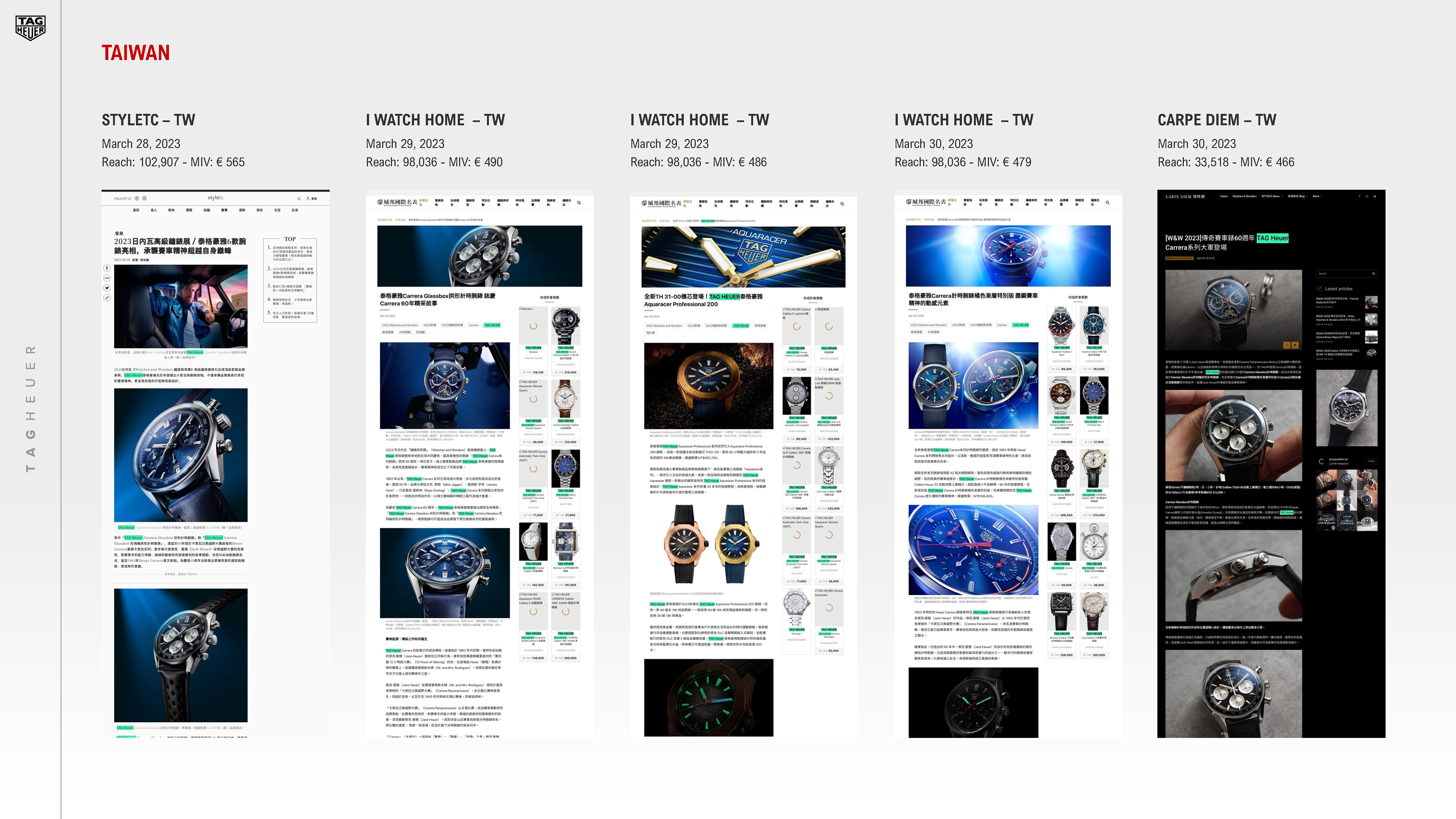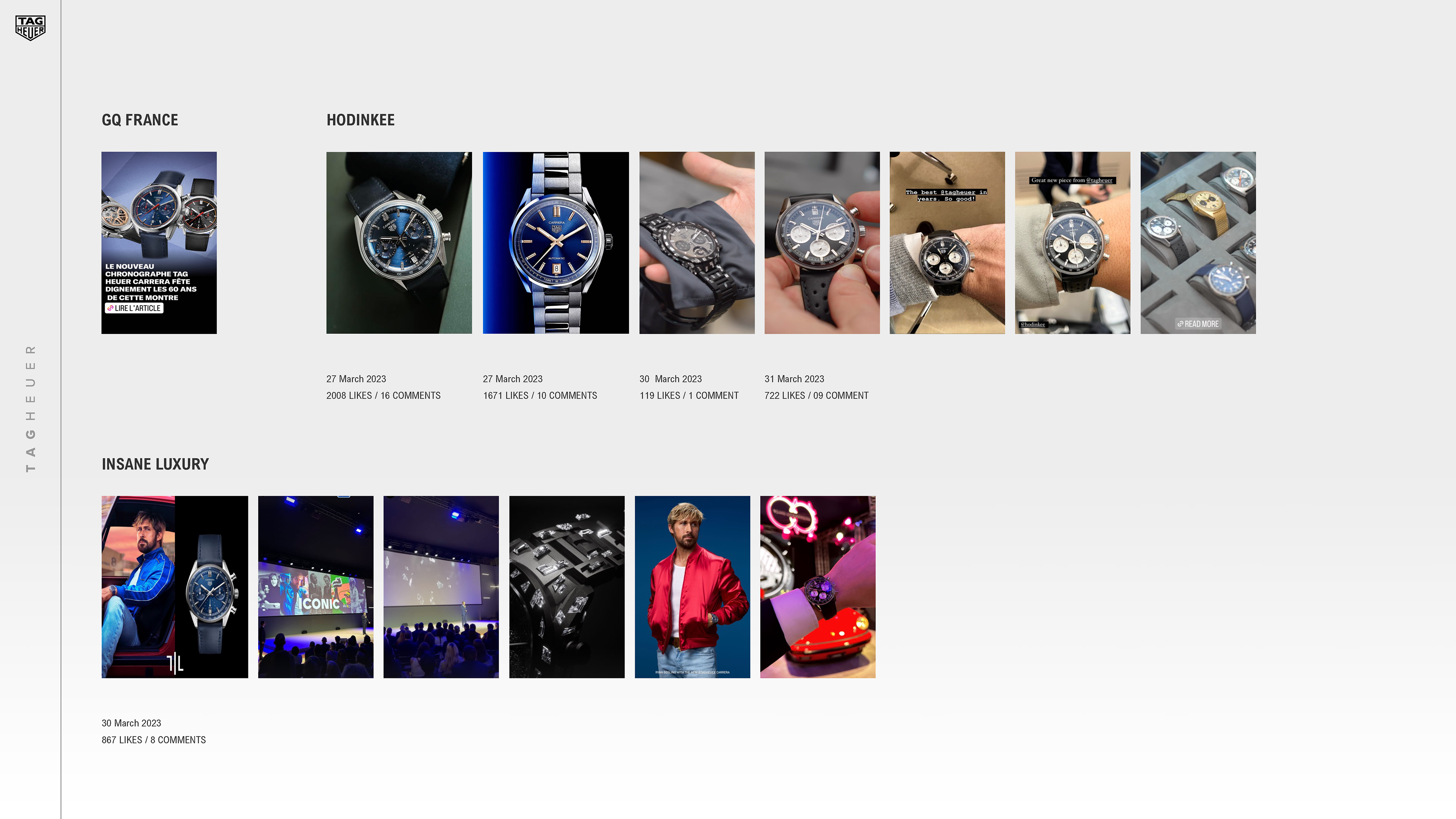 This artwokring project was for Tag Heuer, and it involved creating a presentation for one of their PR reports. They needed me to make a presentation out of the images and data that they provided me, so this meant choosing the correct imagery for the right pages, making sure all the data was correctly input, and the layout was clean and easy to read.
